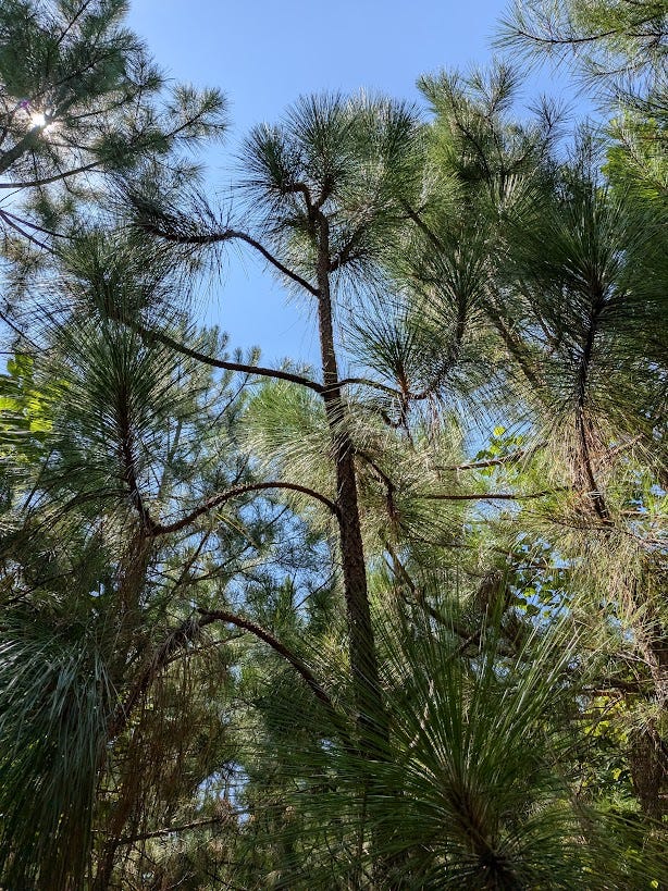 It's quiet. The pine needles are soft underfoot, a breeze whispers above. Distantly the dam… I daydream from photos of mature longleaf forests, silence and soft light. A flash of motion brings me back to now… a hummingbird appears in the clearing before me. Left, right, up, and away with that dense buzz. The sun slants down through the glossy green pines.
